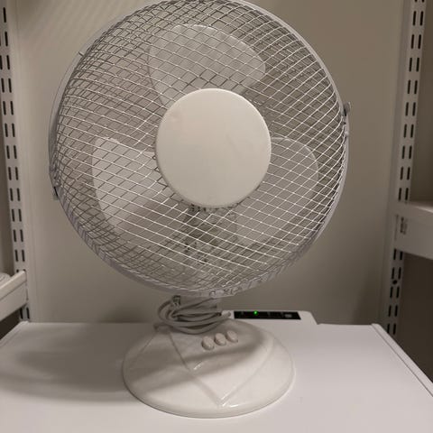Bordvifte med tre vifteblader og beskyttelsesnett. Viften har justerbar vinkel og tre hastighetsinnstillinger styrt med knapper på basen. Strømkabel er festet til viften.