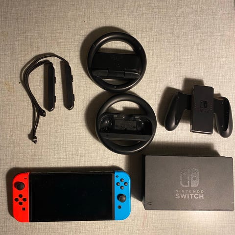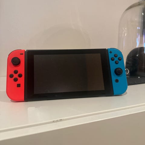 Nintendo Switch OLED konsoll i hvit. Skjermen har beskyttelses glass på seg, satt på når den var ny. Det følger også med et nytt beskyttelses glass. Inkluderer strømkabel, hdmi, docking, ekstra par med joy cons i blå/gul, switch pro kontroll, oppbevaringseske og spillene som 1-2-Switch, Everybody switch, Pokémon Arceus & It takes two. Original eske følger med.