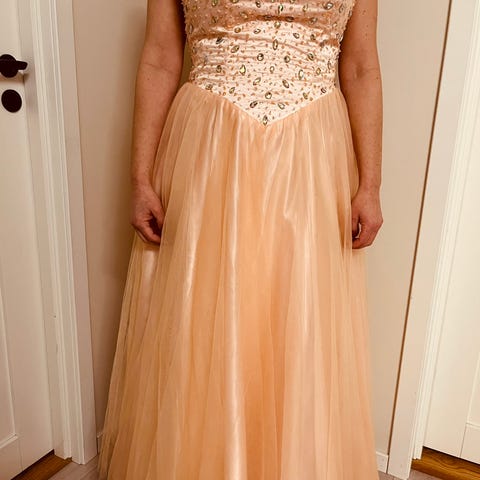 Ballkjole fra merket Diin i størrelse S-M. Kjolen er gul. Den er kjøpt brukt, men fremstår i god stand. Renset før vårt bruk. Kun brukt i 4t her.