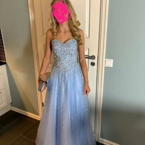 Nydelig kjole med en flott farge. Ytterskjørt er i tyll, men selve kjolen under er i mer silkelignende stoff.