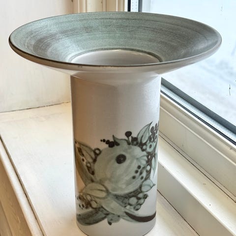 Klassisk svensk design fra ca. 1950–60-tallet, i grå glasur med håndmalt sort botanisk dekor.
