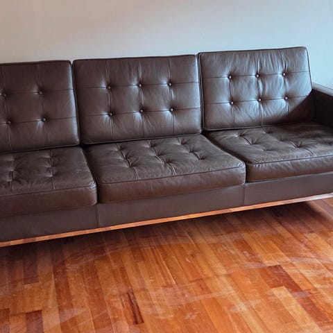 Sofaen er i fin stand med pen patina. Skinnet er litt solbleket og en hel del lysere nå.