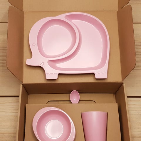 Består av fem deler: tallerken, kopp, skål, gaffel og skje. Kan vaskes i oppvaskmaskinen.