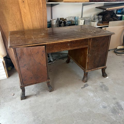 Antikk skrivebord i heltre eik med skuffer og skap