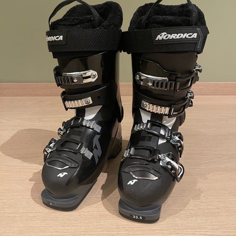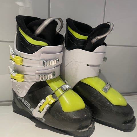 Står 23 under sålene, 23,5 og 38 på innersko. Støvlene har justerbare spenner og borrelås for tilpasning. Yttersålen er laget for god feste og stabilitet under alpintkjøring.