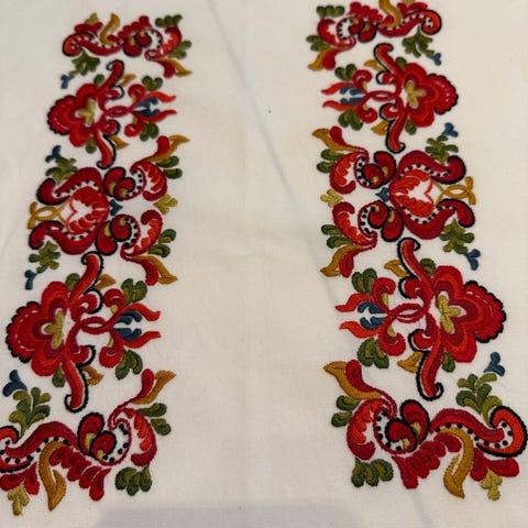 Brodert duk med tradisjonelt fargemønster i rød, gul, blå og grønn på lys bakgrunn. Duken har et sentralt dekorativt motiv og mindre mønstre langs kantene. Egnet til dekorasjon på bord.
