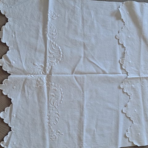 Det er ingen duk, men et kjøkken- pyntehåndkle. Dette er gammelt arvegods etter foreldre-besteforeldre- oldeforeldre. Vil tro det er over 100 år gammelt da mine foreldre var født i 1915.