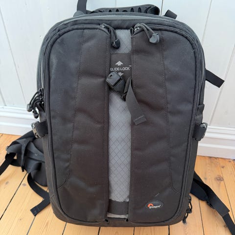 Lowepro ProTactic ryggsekk i svart farge. Designet for å bære og beskytte kamerautstyr med flere rom og polstrede seksjoner. Egnet for fotografer som trenger organisert oppbevaring og enkel tilgang til utstyr.
