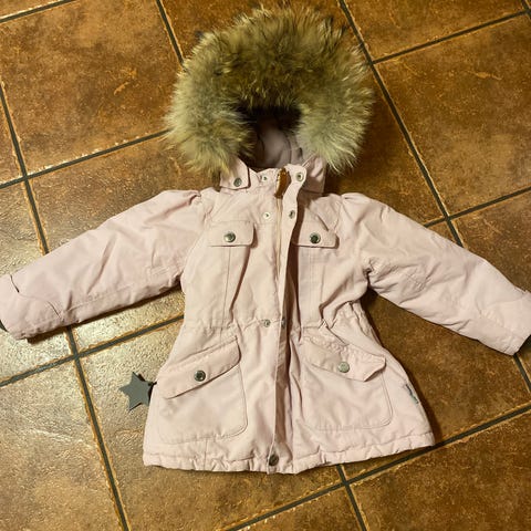 Pent brukt vinterjakke fra H&M i størrelse 3-4 år. Søt rosa farge. Avtagbar hette med fuskepelskant.