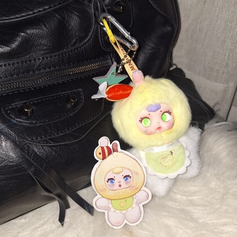 Nøkkelring laget av svart garn med røde og hvite detaljer. Har metallanheng og kulekjede. Passer til å feste nøkler eller som dekorativt tilbehør.