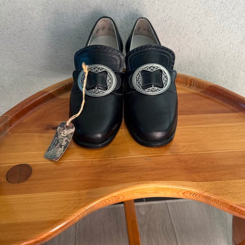 Skoene er brukt 5-6 ganger og har en del bruksmerker (se bilder). Riper kan poleres for de som kan eller leveres inn til skomaker😊 Ny pris var 1699,-