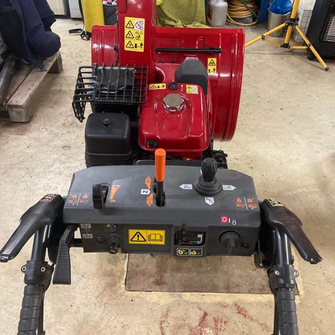 Honda HS 55 snøfreser utstyrt med belter for bedre fremkommelighet. Maskinen drives av en bensinmotor. Designet for effektiv snørydding.