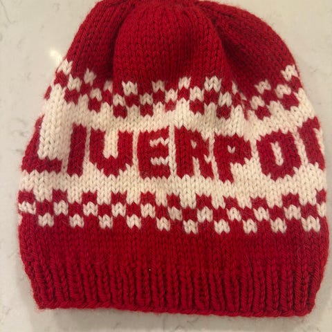 Liverpool lue som passer både herre, dame og ungdom. Strikket med garnet Pt5 fra Rauma. Vidde 46 cm og er godt tøyelig til ca 52 cm. Kjøper bet event porto