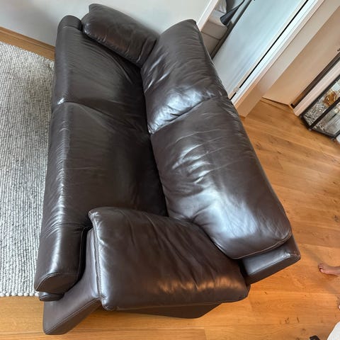 Skinnet på toseteren er i eksepsjonelt god stand. Omtrent ingen tegn til bruk utenom en mangle de knapp på venstre armlen.