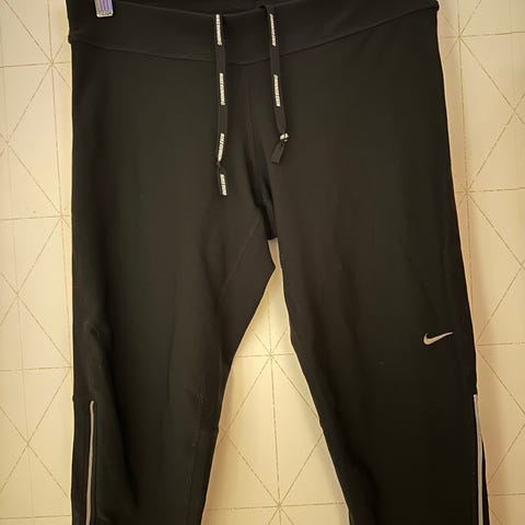 Nike løpebukse for dame i størrelse M, blå farge. Designet for løping med funksjonelle materialer som gir komfort under aktivitet.
