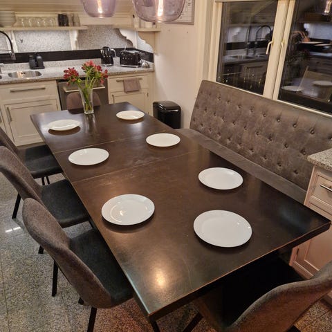 Rundt hvit spise bord, avlangt med plate. Har en god del hakk i seg, enkelt å fikse om man vil. Må hentes på lindern/tannlegehøyskolen, helst snarest.