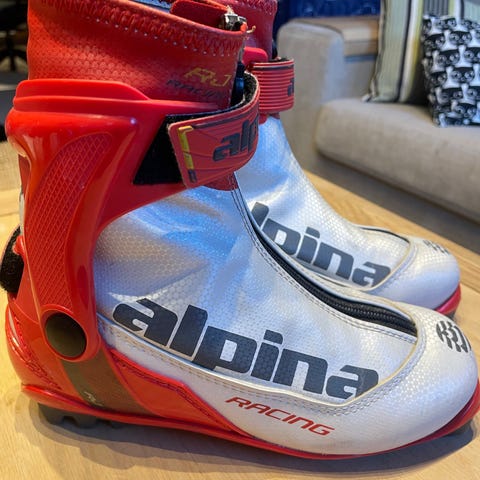 Alpina skisko i rød og hvit farge. Designet for langrenn med glidelås foran og borrelås rundt ankelen for ekstra støtte.