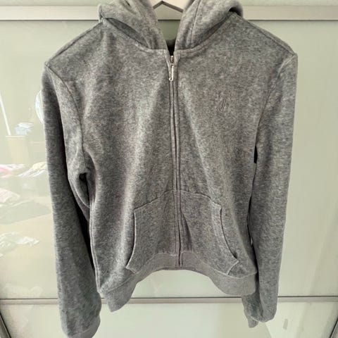 Juicy Couture hettegenser i størrelse XS. Bukse i str M. Genseren og buksen har en blå farge med en ombre-effekt. Med hette og glidelås. Den har dekorativ tekst på ryggen. Buksen har tekst på låret.