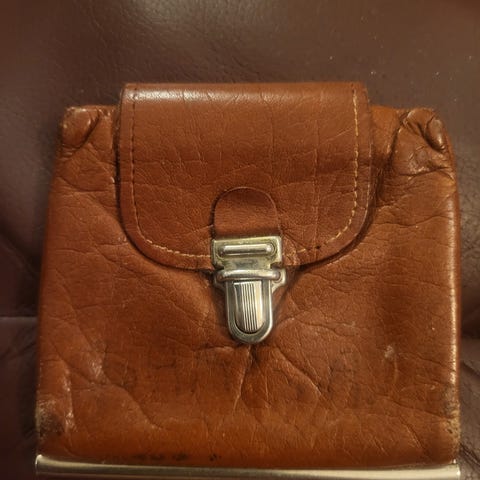 Bredde 6cm. Høyde 9,5 cm. Ekte lær. Fra 70 tallet.
