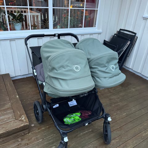 - 2 sittedeler (selen er ødelagt på den ene, men følger med en annen sele som man får festet barnet med. Se bilde)