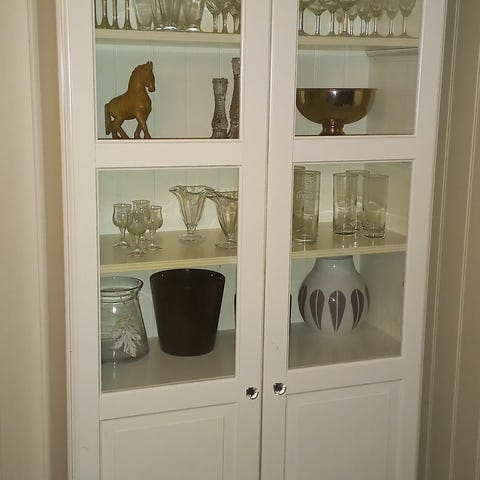 Selger et pent brukt vitrineskap. Jeg mener det er fra IKEA bestå sin serie, men ikke lenger i sortimentet. Skapet henger på veggen og er i god stand.