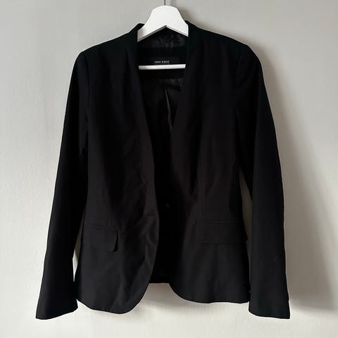 Zara blazer i svart farge, laget av polyester materiale. Passer til dame i størrelse L. Jakken har klassisk design med knapper på ermene.