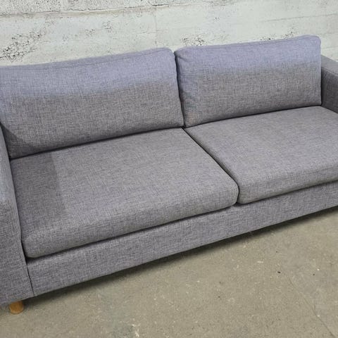 Blå sofa med to seterputer og to ryggputer. Sofaen har rette armlener og metallben. Stoffmateriale i blå farge. Fra 2015 men lite brukt i hverdagen. Stoffet er ikke tipp topp (noe solbleket etc.)men er helt og slitesterkt stoff. Har renset med maskin. Trekk på alle puter kan tas av og renses. Trekkes den om vil den fremstå som ny. Flere mål: sittedybde 45, høyde armlener 60, sittehøyde 45.
