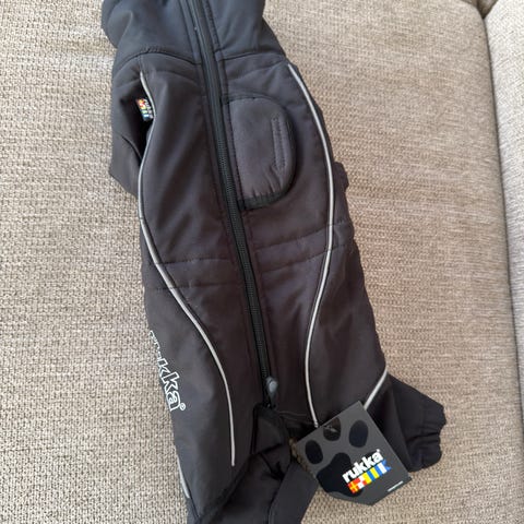 Dressen er helt ny, men har tatt av lappen. Har kun prøvd den på hunden vår en gang, men dressen ble desverre for stor.