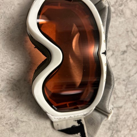Dr. Zipe skibriller med oransje linse og justerbar fargerik stropp. Brillen har hvit ramme og er egnet for bruk i vintersportaktiviteter.
