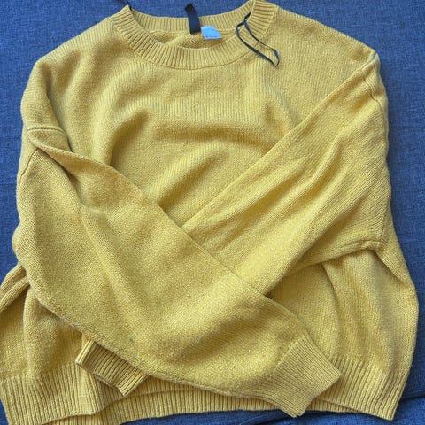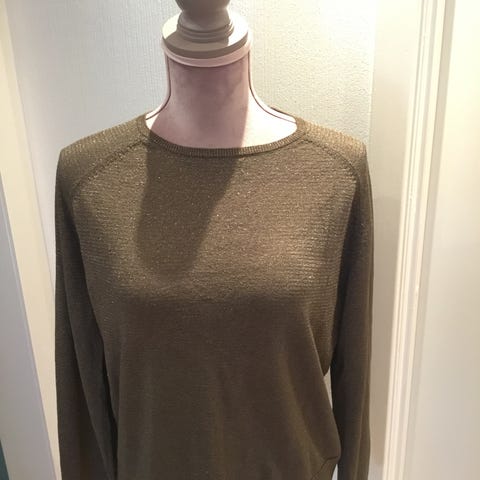 H&M genser i gullfarge, størrelse M, laget av viskose, poliester, metalliserte fibre, elastan.