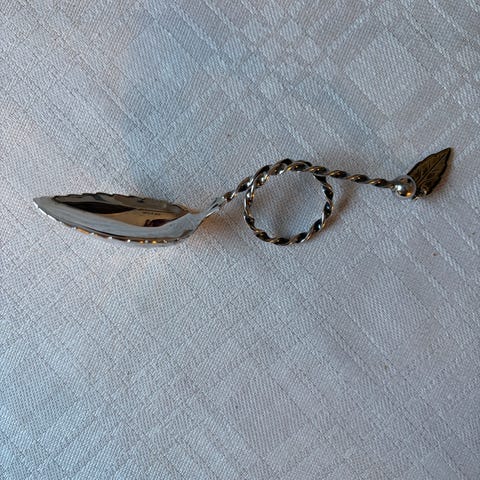 Kniv med dekorativt metallhåndtak med utskårne mønstre. Håndtaket har en sølvfarget finish. Kniven har en rett bladform og er håndholdt. Ingen ytterligere merke- eller modellinformasjon tilgjengelig.