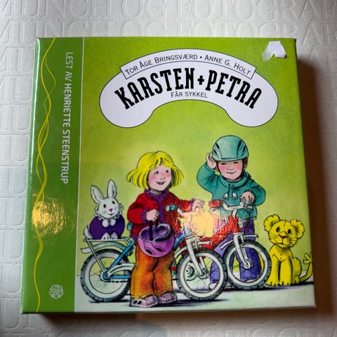 Karsten og Petra barnebok med fargerikt omslag. Passer for barn, inneholder illustrasjoner av karakterene Karsten og Petra på sykkel.