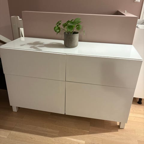 Pent brukt skjenk. Brukt som tv benk. Derfor er det laget hull i midten av skjenken . Det er en sponplate bak som er mulig å bytte ut. Ingen store bruksmerker på skjenken, utenom normal slitasje .