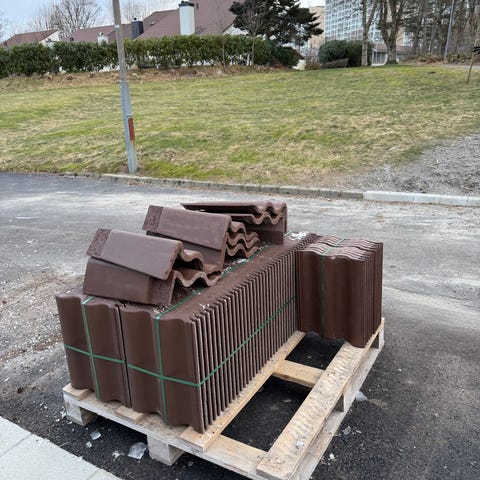 Takstein i rød tegl, av merket Benders, girs bort mot henting. I alt ca 60 stykk. Ca 30 år gamle.