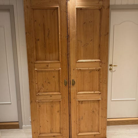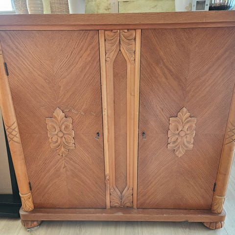 Antikk skap laget i tre med en dør, innvendige hyller og en skuff nederst. Skapet har dekorative detaljer og en låsbar dør.
