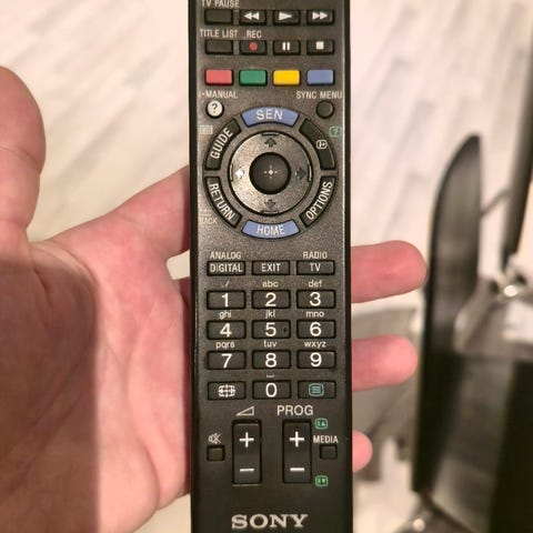 Sony TV med fjernkontroll og flere tilkoblingsmuligheter. Produktet har et flatt skjermdesign og hvit ramme.
