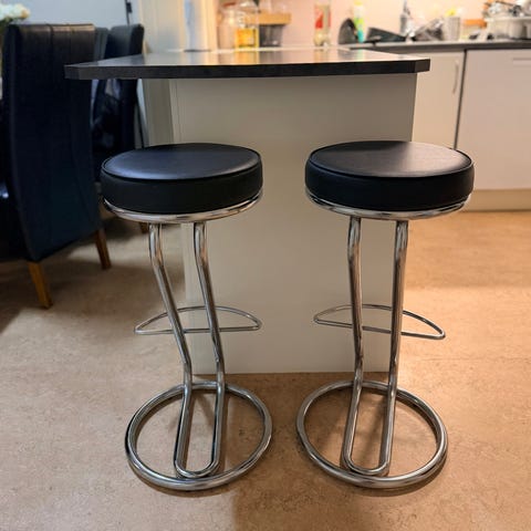 Selger to stk barstoler. Lite brukt, selger i fin brukt stand. Stoff og innebygd pute i setet.trekket går også over ryggen. Høgde fra foten nederst til setet er 74cm.