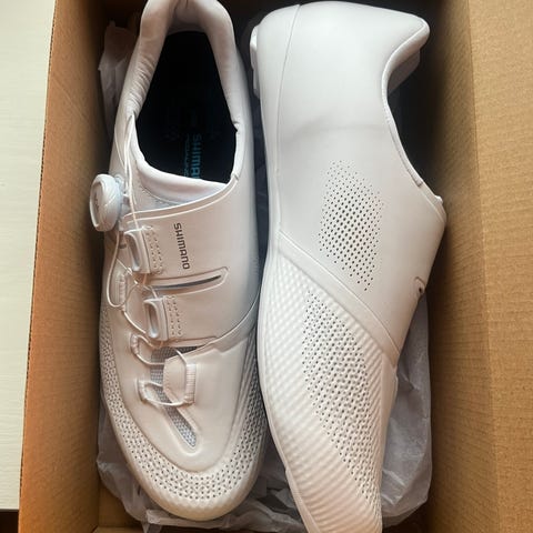Shimano R315 sykkelsko i størrelse 42, hvit farge. Skoene har borrelåsfeste og er designet for landeveissykling.