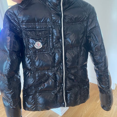 Moncler vinterjakke for herre i størrelse XS. Jakken er svart og laget med dun som materiale, egnet for kalde værforhold.