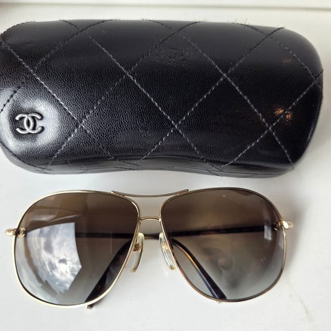 Versace dame solbriller med mørke glass og metallramme. Solbrillene har dekorative detaljer på sidene og kommer med etui og bruksanvisning. Selges da de er litt for vide for meg.