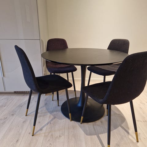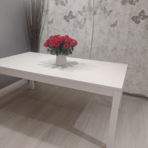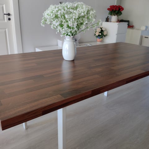 Kjøkkenbord med to innleggsplater (50cm bredde per plate) selges, grunnet flytting. Bordet er i god stand, men har noen synlige flekker. Se egne bilder.