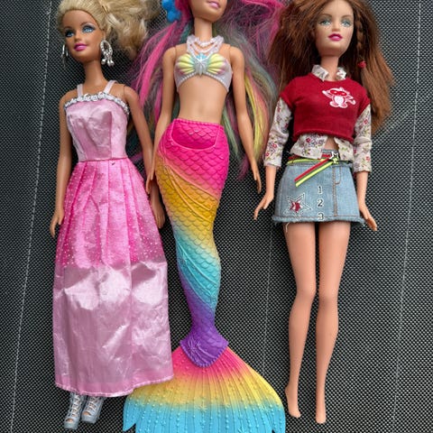 Forskjellige Barbie havfruer og prinsesser, følger også med en sjøhest. Ser ut til å være i ganske god stand, men forekommer noen bruksmerker, se bildene. Prisen er for alt samlet.