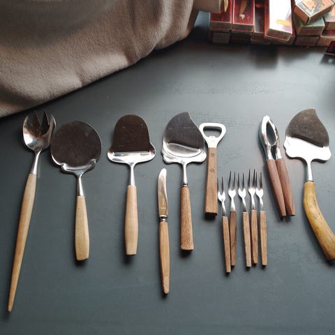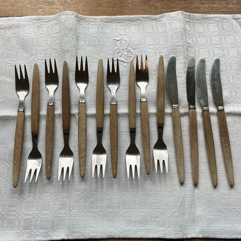Teak kniver, nøtteknekker og kakegafler