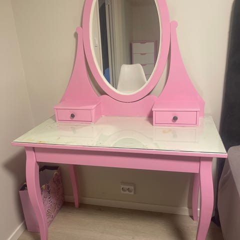 Skrivebord med kontorstol, sminkepult og klokke selges