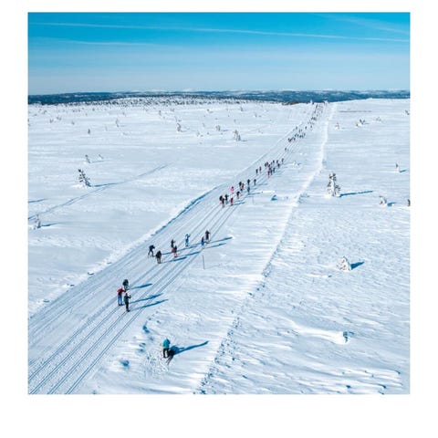 med rød/hvitt design. Brillene er utstyrt med speilglass og leveres med et beskyttende etui. Egnet for bruk under ulike sportsaktiviteter, spesielt langrenn