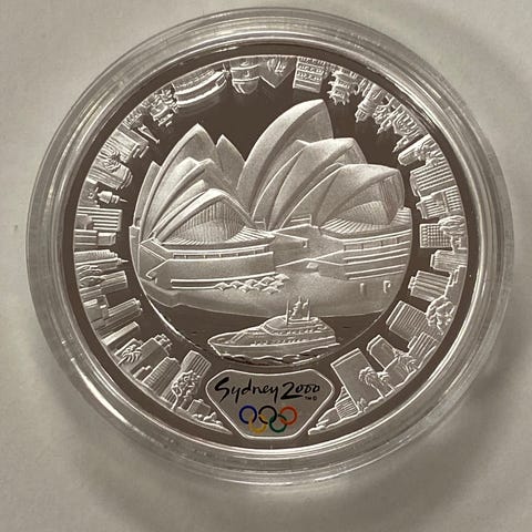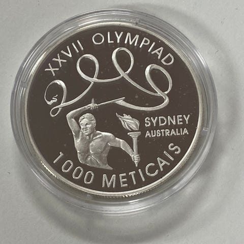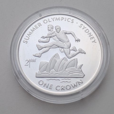 Selger olympisk sølvmynt fra OL i Sydney 2000, utgitt av De Nederlandske Antillene.
