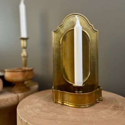 Veggstake med speil for 1 kronelys.Beiset mangotre.Ny i eske.Kan sendes for 79 kr om ønskelig
