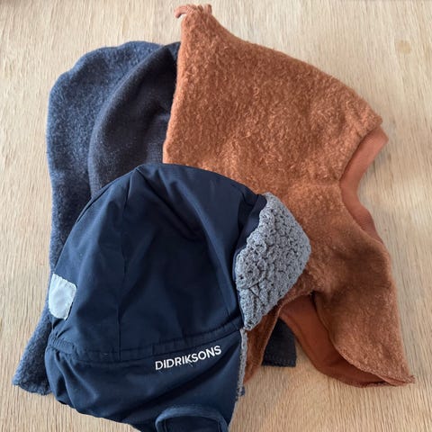Klespakke : halser og luer - alt samlet , det meste er pent brukt . Noe flekk på grønn hals og lue. Ellers pent brukt