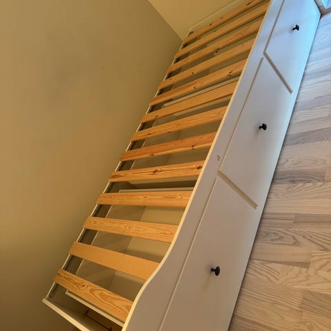 IKEA seng med oppbevaringsskuffer i hvit farge. Sengen har mål på 205 cm i lengde, 142 cm i bredde og 86 cm i høyde. Inkluderer en madrass med dimensjoner 90x200 cm. Sengen har et solid rammeverk og flere skuffer for oppbevaring under sengen.