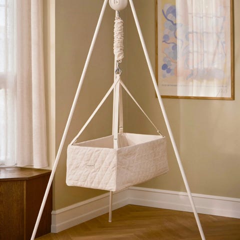 Koselig Classic™ vugge fra Leander som enten kan henges fra taket i den medfølgende kroken, eller i et stativ (selges separat). Dette muliggjør rolig og fri gynging i alle retninger. Bevegelsene er beroligende, samtidig som babyens sanser, balanse og motorikk stimuleres.